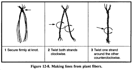 Before making cordage, there are a few simple tests you can do to determine you material's suitability. First, pull on a length of the material to test for strength. Next, twist it between your fingers and roll the fibers together. If it withstands this handling and does not snap apart, tie an overhand knot with the fibers and gently tighten. If the knot does not break, the material is usable. Figure 12-8 shows various methods of making cordage.