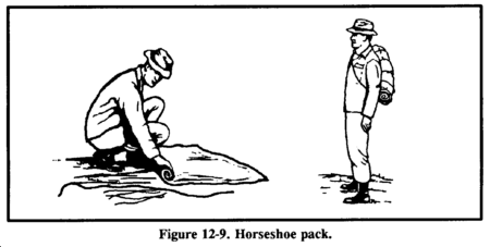 This pack is simple to make and use and relatively comfortable to carry over one shoulder. Lay available square-shaped material, such as poncho, blanket, or canvas, flat on the ground. Lay items on one edge of the material. Pad the hard items. Roll the material (with the items) toward the opposite edge and tie both ends securely. Add extra ties along the length of the bundle. You can drape the pack over one shoulder with a line connecting the two ends (Figure 12-9).