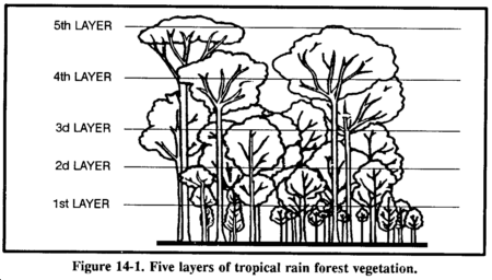 There are five layers of vegetation in this jungle (Figure 14-1). Where untouched by man, jungle trees rise from buttress roots to heights of 60 meters. Below them, smaller trees produce a canopy so thick that little light reaches the jungle floor. Seedlings struggle beneath them to reach light, and masses of vines and lianas twine up to the sun. Ferns, mosses, and herbaceous plants push through a thick carpet of leaves, and a great variety of fungi grow on leaves and fallen tree trunks.