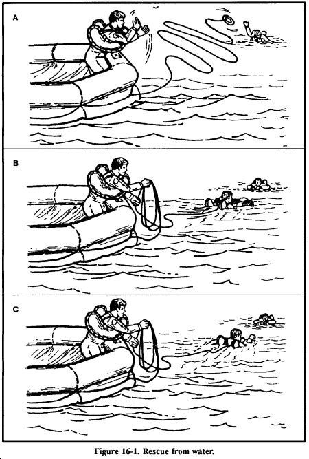 A search for survivors usually takes place around the entire area of and near the crash site. Missing personnel may be unconscious and floating low in the water. Figure 16-1 illustrates rescue procedures.
