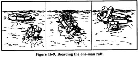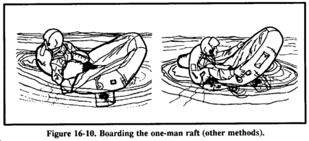 A lanyard connects the one-man raft to a parachutist (survivor) landing in the water. You (the survivor) inflate it upon landing. You do not swim to the raft, but pull it to you via the lanyard. The raft may hit the water upside down, but you can right it by approaching the side to which the bottle is attached and flipping the raft over. The spray shield must be in the raft to expose the boarding handles. Follow the steps outlined in the note under raft procedures above when boarding the raft (Figure 16-9).