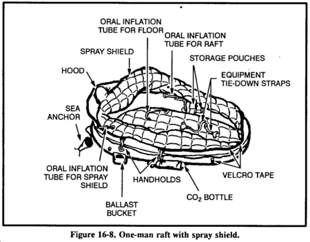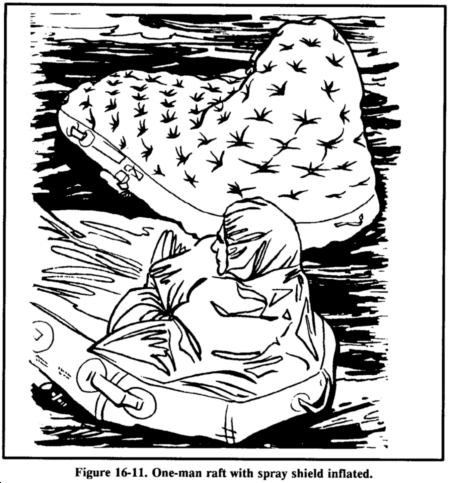 In rough seas, it may be easier for you to grasp the small end of the raft and, in a prone position, to kick and pull yourself into the raft. When you are lying face down in the raft, deploy and adjust the sea anchor. To sit upright, you may have to disconnect one side of the seat kit and roll to that side. Then you adjust the spray shield. There are two variations of the one-man raft; the improved model incorporates an inflatable spray shield and floor that provide additional insulation. The spray shield helps keep you dry and warm in cold oceans and protects you from the sun in the hot climates (Figure 16-11).
