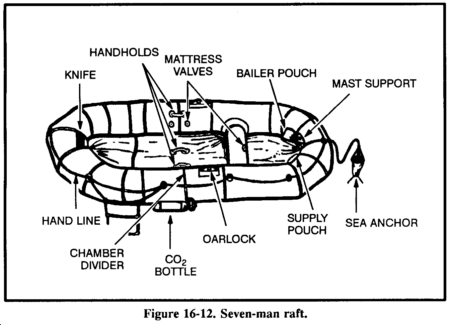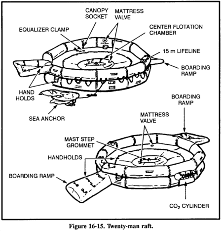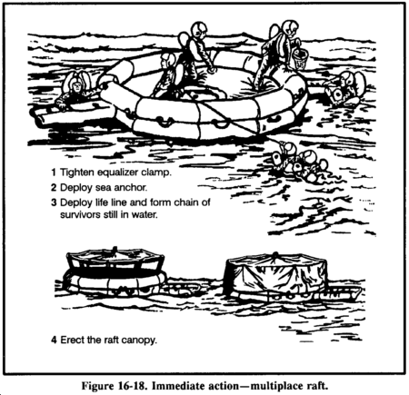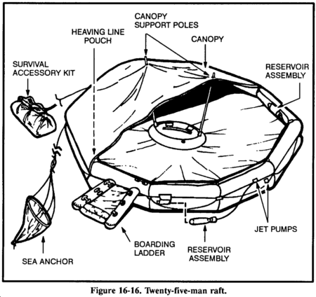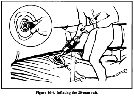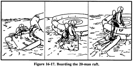 You may find 20- or 25-man rafts in multiplace aircraft (Figures 16-15 and 16-16). You will find them in accessible areas of the fuselage or in raft compartments. Some may be automatically deployed from the cock-pit, while others may need manual deployment. No matter how the raft lands in the water, it is ready for boarding. A lanyard connects the accessory kit to the raft and you retrieve the kit by hand. You must manually inflate the center chamber with the hand pump. Board the 20- or 25-man raft from the aircraft, if possible. If not, board in the following manner: