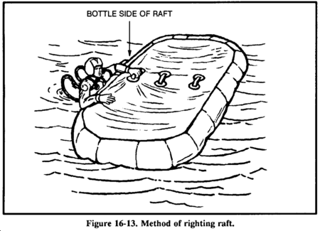 Some multiplace aircraft carry the seven-man raft. It is a component of the survival drop kit (Figure 16-12). This raft may inflate upside down and require you to right the raft before boarding. Always work from the bottle side to prevent injury if the raft turns over. Facing into the wind, the wind provides additional help in righting the raft. Use the handles on the inside bottom of the raft for boarding (Figure 16-13).