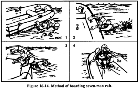 Use the boarding ramp if someone holds down the raft's opposite side. If you don't have help, again work from the bottle side with the wind at your back to help hold down the raft. Follow the steps outlined in the note under raft procedures above. Then grasp an oarlock and boarding handle, kick your legs to get your body prone on the water, and then kick and pull yourself into the raft. If you are weak or injured, you may partially deflate the raft to make boarding easier (Figure 16-14).