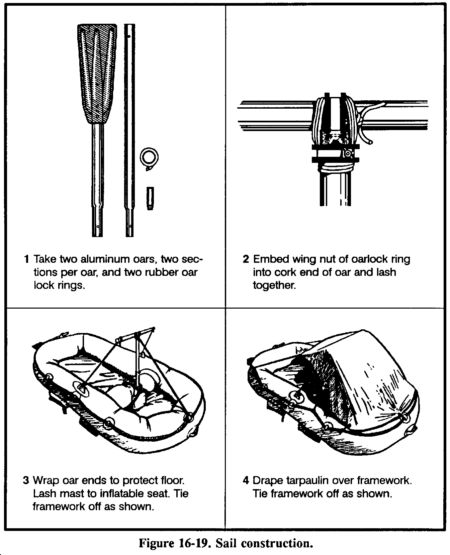 In a multiplace (except 20- to 25-man) raft, erect a square sail in the bow using the oars and their extensions as the mast and crossbar (Figure 16-19). You may use a waterproof tarpaulin or parachute material for the sail. If the raft has no regular mast socket and step, erect the mast by tying it securely to the front cross seat using braces. Pad the bottom of the mast to prevent it from chafing or punching a hole through the floor, whether or not there is a socket. The heel of a shoe, with the toe wedged under the seat, makes a good improvised mast step. Do not secure the comers of the lower edge of the sail. Hold the lines attached to the comers with your hands so that a gust of wind will not rip the sail, break the mast, or capsize the raft.