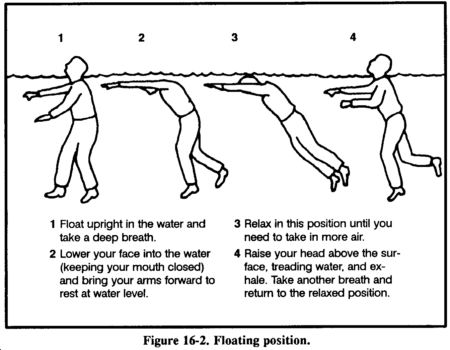 Floating on your back takes the least energy. Lie on your back in the water, spread your arms and legs, and arch your back. By controlling your breathing in and out, your face will always be out of the water and you may even sleep in this position for short periods. Your head will be partially submerged, but your face will be above water. If you cannot float on your back or if the sea is too rough, float facedown in the water as shown in Figure 16-2.