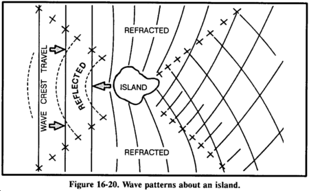 You may be able to detect land by the pattern of the waves (refracted) as they approach land (Figure 16-20). By traveling with the waves and parallel to the slightly turbulent area marked "X" on the illustration, you should reach land.