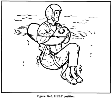 If you have a life preserver, you can stay afloat for an indefinite period. In this case, use the "HELP" body position: Heat Escaping Lessening Posture (HELP). Remain still and assume the fetal position to help you retain body heat. You lose about 50 percent of your body heat through your head. Therefore, keep your head out of the water. Other areas of high heat loss are the neck, the sides, and the groin. Figure 16-3 illustrates the HELP position.