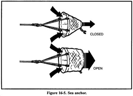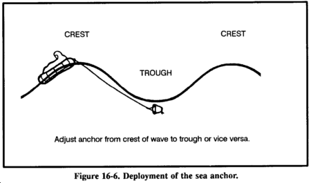 Additionally, adjust the sea anchor so that when the raft is on the wave's crest, the sea anchor is in the wave's trough (Figure 16-6).