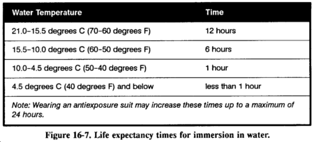 The greatest problem you face when submerged in cold water is death due to hypothermia. When you are immersed in cold water, hypothermia occurs rapidly due to the decreased insulating quality of wet clothing and the result of water displacing the layer of still air that normally surrounds the body. The rate of heat exchange in water is about 25 times greater than it is in air of the same temperature. Figure 16-7 lists life expectancy times for immersion in water.
