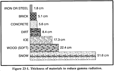 The thickness required to weaken gamma radiation from fallout is far less than that needed to shield against initial gamma radiation. Fallout radiation has less energy than a nuclear detonation's initial radiation. For fallout radiation, a relatively small amount of shielding material can provide adequate protection. Figure 23-1 gives an idea of the thickness of various materials needed to reduce residual gamma radiation transmission by 50 percent.