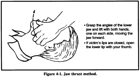 Step 3. Using the jaw thrust method, grasp the angles of the victim's lower jaw and lift with both hands, one on each side, moving the jaw forward. For stability, rest your elbows on the surface on which the victim is lying. If his lips are closed, gently open the lower lip with your thumb (Figure 4-1).