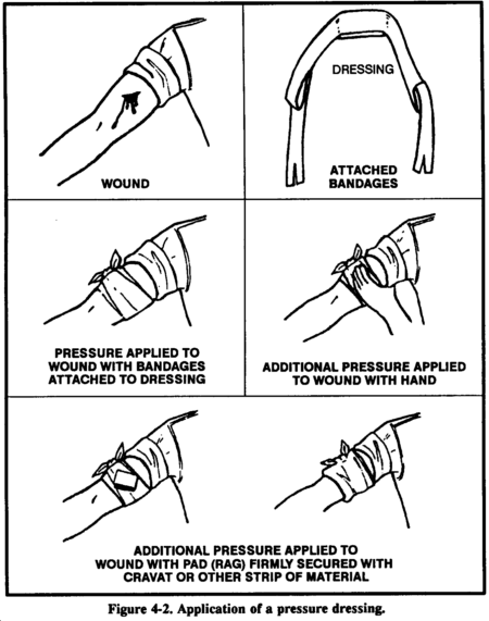 If bleeding continues after having applied direct pressure for 30 minutes, apply a pressure dressing. This dressing consists of a thick dressing of gauze or other suitable material applied directly over the wound and held in place with a tightly wrapped bandage (Figure 4-2). It should be tighter than an ordinary compression bandage but not so tight that it impairs circulation to the rest of the limb. Once you apply the dressing, do not remove it, even when the dressing becomes blood soaked.