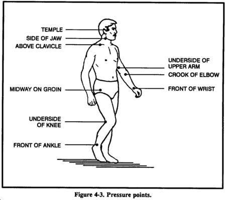 If you cannot remember the exact location of the pressure points, follow this rule: Apply pressure at the end of the joint just above the injured area. On hands, feet, and head, this will be the wrist, ankle, and neck, respectively.