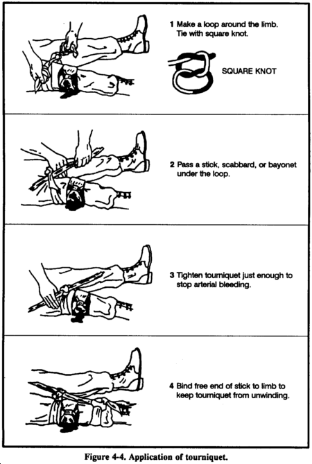 If you must use a tourniquet, place it around the extremity, between the wound and the heart, 5 to 10 centimeters above the wound site (Figure 4-4). Never place it directly over the wound or a fracture. Use a stick as a handle to tighten the tourniquet and tighten it only enough to stop blood flow. When you have tightened the tourniquet, bind the free end of the stick to the limb to prevent unwinding.