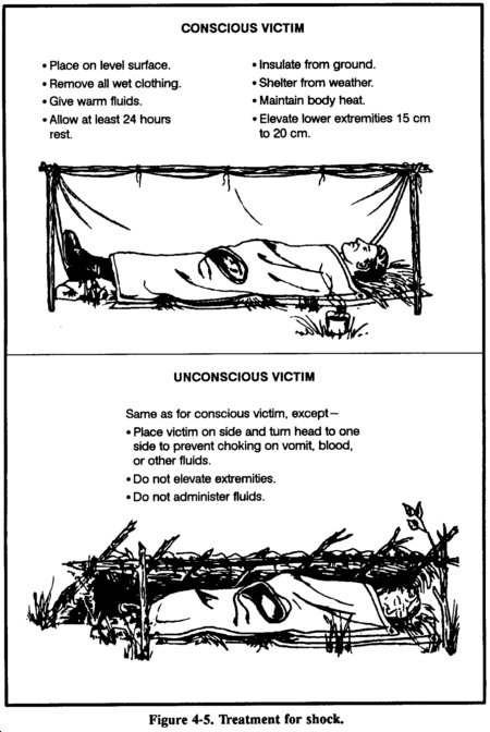 Anticipate shock in all injured personnel. Treat all injured persons as follows, regardless of what symptoms appear (Figure 4-5):