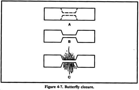 If a wound is gaping, you can bring the edges together with adhesive tape cut in the form of a "butterfly" or "dumbbell" (Figure 4-7).