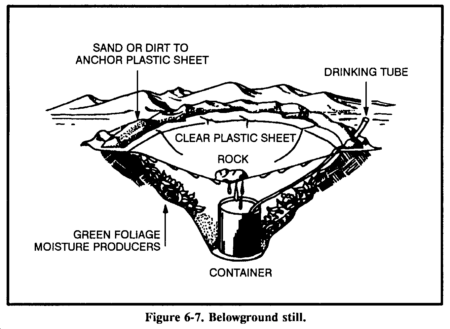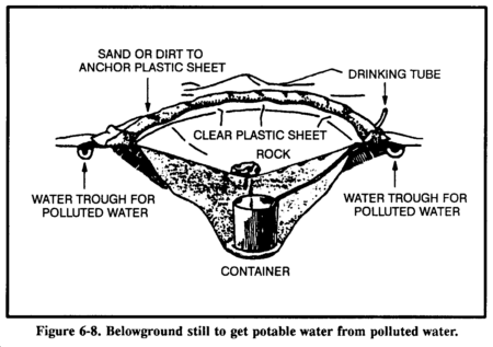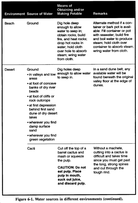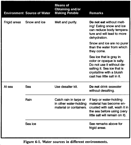 Almost any environment has water present to some degree. Figure 6-1 lists possible sources of water in various environments. It also provides information on how to make the water potable.
