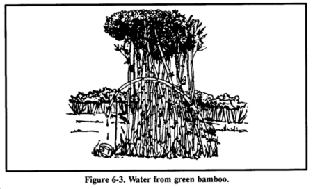 Green bamboo thickets are an excellent source of fresh water. Water from green bamboo is clear and odorless. To get the water, bend a green bamboo stalk, tie it down, and cut off the top (Figure 6-3). The water will drip freely during the night. Old, cracked bamboo may contain water.