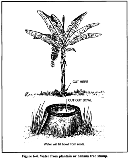 Wherever you find banana or plantain trees, you can get water. Cut down the tree, leaving about a 30-centimeter stump, and scoop out the center of the stump so that the hollow is bowl-shaped. Water from the roots will immediately start to fill the hollow. The first three fillings of water will be bitter, but succeeding fillings will be palatable. The stump (Figure 6-4) will supply water for up to four days. Be sure to cover it to keep out insects.