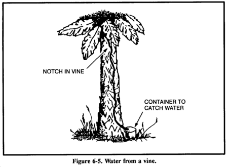 Some tropical vines can give you water. Cut a notch in the vine as high as you can reach, then cut the vine off close to the ground. Catch the dropping liquid in a container or in your mouth (Figure 6-5).