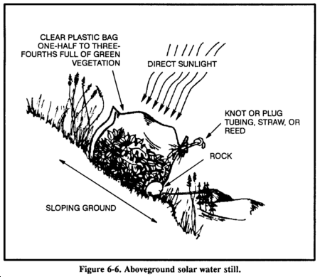 To make the aboveground still, you need a sunny slope on which to place the still, a clear plastic bag, green leafy vegetation, and a small rock (Figure 6-6).