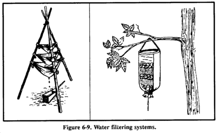 To make a filtering system, place several centimeters or layers of filtering material such as sand, crushed rock, charcoal, or cloth in bamboo, a hollow log, or an article of clothing (Figure 6-9).
