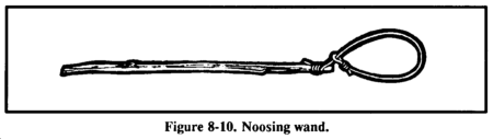 A noose stick or "noosing wand" is useful for capturing roosting birds or small mammals (Figure 8-10). It requires a patient operator. This wand is more a weapon than a trap. It consists of a pole (as long as you can effectively handle) with a slip noose of wire or stiff cordage at the small end. To catch an animal, you slip the noose over the neck of a roosting bird and pull it tight. You can also place it over a den hole and hide in a nearby blind. When the animal emerges from the den, you jerk the pole to tighten the noose and thus capture the animal. Carry a stout club to kill the prey.
