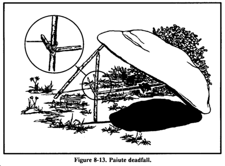 The figure 4 is a trigger used to drop a weight onto a prey and crush it (Figure 8-12). The type of weight used may vary, but it should be heavy enough to kill or incapacitate the prey immediately. Construct the figure 4 using three notched sticks. These notches hold the sticks together in a figure 4 pattern when under tension. Practice making this trigger before-hand; it requires close tolerances and precise angles in its construction.
