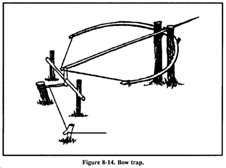 A bow trap is one of the deadliest traps. It is dangerous to man as well as animals (Figure 8-14). To construct this trap, build a bow and anchor it to the ground with pegs. Adjust the aiming point as you anchor the bow. Lash a toggle stick to the trigger stick. Two upright sticks driven into the ground hold the trigger stick in place at a point where the toggle stick will engage the pulled bow string. Place a catch stick between the toggle stick and a stake driven into the ground. Tie a trip wire or cordage to the catch stick and route it around stakes and across the game trail where you tie it off (as in Figure 8-14). When the prey trips the trip wire, the bow looses an arrow into it. A notch in the bow serves to help aim the arrow.