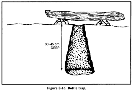 A bottle trap is a simple trap for mice and voles (Figure 8-16). Dig a hole 30 to 45 centimeters deep that is wider at the bottom than at the top. Make the top of the hole as small as possible. Place a piece of bark or wood over the hole with small stones under it to hold it up 2.5 to 5 centimeters off the ground. Mice or voles will hide under the cover to escape danger and fall into the hole. They cannot climb out because of the wall's backward slope. Use caution when checking this trap; it is an excellent hiding place for snakes.