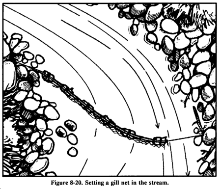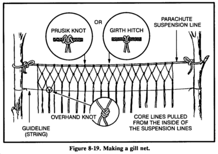 If a gill net is not available, you can make one using parachute suspension line or similar material (Figure 8-19). Remove the core lines from the suspension line and tie the easing between two trees. Attach several core lines to the easing by doubling them over and tying them with prusik knots or girth hitches. The length of the desired net and the size of the mesh determine the number of core lines used and the space between them. Starting at one end of the easing, tie the second and the third core lines together using an overhand knot. Then tie the fourth and fifth, sixth and seventh, and so on, until you reach the last core line. You should now have all core lines tied in pairs with a single core line hanging at each end. Start the second row with the first core line, tie it to the second, the third to the fourth, and so on.