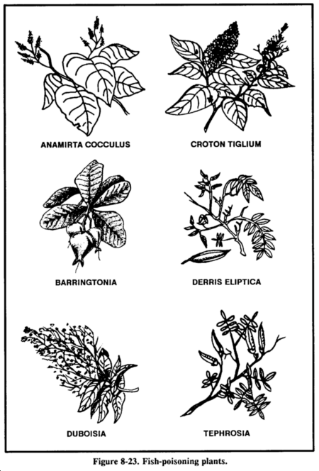 Another way to catch fish is by using poison. Poison works quickly. It allows you to remain concealed while it takes effect. It also enables you to catch several fish at one time. When using fish poison, be sure to gather all of the affected fish, because many dead fish floating downstream could arouse suspicion. Some plants that grow in warm regions of the world contain rotenone, a substance that stuns or kills cold-blooded animals but does not harm persons who eat the animals. The best place to use rotenone, or rotenone-producing plants, is in ponds or the headwaiters of small streams containing fish. Rotenone works quickly on fish in water 21 degrees C (70 degrees F) or above. The fish rise helplessly to the surface. It works slowly in water 10 to 21 degrees C (50 to 70 degrees F) and is ineffective in water below 10 degrees C (50 degrees F). The following plants, used as indicated, will stun or kill fish: