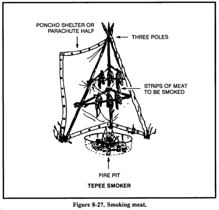 To smoke meat, prepare an enclosure around a fire (Figure 8-27). Two ponchos snapped together will work. The fire does not need to be big or hot. The intent is to produce smoke, not heat. Do not use resinous wood in the fire because its smoke will ruin the meat. Use hardwoods to produce good smoke. The wood should be somewhat green. If it is too dry, soak it. Cut the meat into thin slices, no more than 6 centimeters thick, and drape them over a framework. Make sure none of the meat touches another piece. Keep the poncho enclosure around the meat to hold the smoke and keep a close watch on the fire. Do not let the fire get too hot. Meat smoked overnight in this manner will last about 1 week. Two days of continuous smoking will preserve the meat for 2 to 4 weeks. Properly smoked meat will look like a dark, curled, brittle stick and you can eat it without further cooking. You can also use a pit to smoke meat (Figure 8-28).