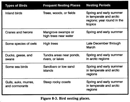 All species of birds are edible, although the flavor will vary considerably. You may skin fish-eating birds to improve their taste. As with any wild animal, you must understand birds' common habits to have a realistic chance of capturing them. You can take pigeons, as well as some other species, from their roost at night by hand. During the nesting season, some species will not leave the nest even when approached. Knowing where and when the birds nest makes catching them easier (Figure 8-3). Birds tend to have regular flyways going from the roost to a feeding area, to water, and so forth. Careful observation should reveal where these flyways are and indicate good areas for catching birds in nets stretched across the flyways (Figure 8-4). Roosting sites and waterholes are some of the most promising areas for trapping or snaring.