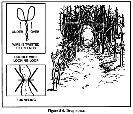 Use a drag noose on an animal run (Figure 8-6). Place forked sticks on either side of the run and lay a sturdy crossmember across them. Tie the noose to the crossmember and hang it at a height above the animal's head. (Nooses designed to catch by the head should never be low enough for the prey to step into with a foot.) As the noose tightens around the animal's neck, the animal pulls the crossmember from the forked sticks and drags it along. The surrounding vegetation quickly catches the crossmember and the animal becomes entangled.