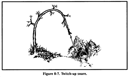 A twitch-up is a supple sapling, which, when bent over and secured with a triggering device, will provide power to a variety of snares. Select a hardwood sapling along the trail. A twitch-up will work much faster and with more force if you remove all the branches and foliage.