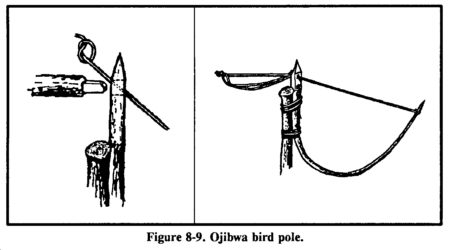 An Ojibwa bird pole is a snare used by native Americans for centuries (Figure 8-9). To be effective, place it in a relatively open area away from tall trees. For best results, pick a spot near feeding areas, dusting areas, or watering holes. Cut a pole 1.8 to 2.1 meters long and trim away all limbs and foliage. Do not use resinous wood such as pine. Sharpen the upper end to a point, then drill a small diameter hole 5 to 7.5 centimeters down from the top. Cut a small stick 10 to 15 centimeters long and shape one end so that it will almost fit into the hole. This is the perch. Plant the long pole in the ground with the pointed end up. Tie a small weight, about equal to the weight of the targeted species, to a length of cordage. Pass the free end of the cordage through the hole, and tie a slip noose that covers the perch. Tie a single overhand knot in the cordage and place the perch against the hole. Allow the cordage to slip through the hole until the overhand knot rests against the pole and the top of the perch. The tension of the overhand knot against the pole and perch will hold the perch in position. Spread the noose over the perch, ensuring it covers the perch and drapes over on both sides. Most birds prefer to rest on something above ground and will land on the perch. As soon as the bird lands, the perch will fall, releasing the over-hand knot and allowing the weight to drop. The noose will tighten around the bird's feet, capturing it. If the weight is too heavy, it will cut the bird's feet off, allowing it to escape.