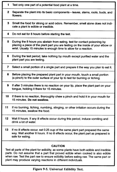 There are many plants throughout the world. Tasting or swallowing even a small portion of some can cause severe discomfort, extreme internal disorders, and even death. Therefore, if you have the slightest doubt about a plant's edibility, apply the Universal Edibility Test (Figure 9-5) before eating any portion of it.