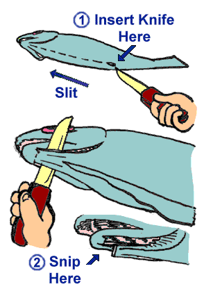 the head off right below the gills. Cut the tail where it joins the body. |