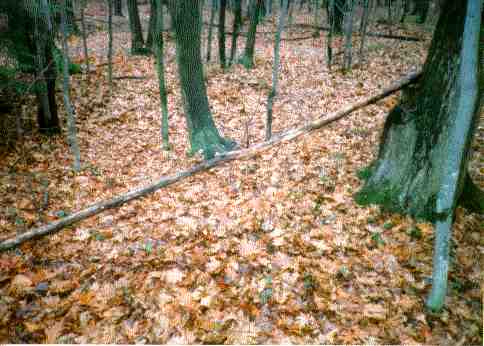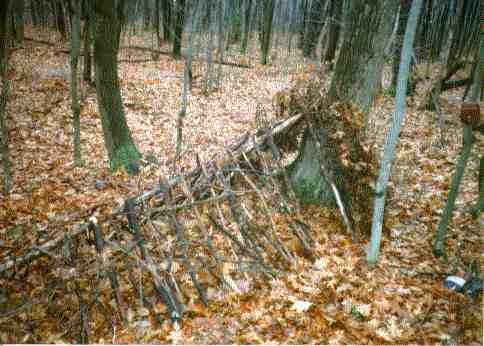 ![]() | A strong ridge pole and a good location are the first steps to the debris hut. Make sure the area is high and dry to avoid any problems with water drainage during a storm. The area was checked for abundance of material and possible hazards. (i.e. poisonous plants, insets, deadfalls, widow-makers, etc.) Direction is noted for the door. Look closely; you may find my tracks in a thin layer of debris under the ridgepole. |