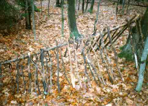 | Next, sticks are placed as ribbing along both sides of the ridge pole. This is done after I have laid down and measured the interior. Note the door opening near the sapling facing east or slightly southeast. | ![]() |