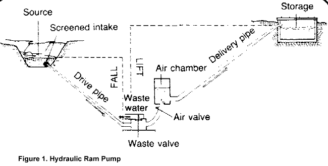 A hydraulic ram installation consists of a supply, a drive pipe, the ram, a supply line and usually a storage tank. These are shown in Figure 1. Each of these component parts is discussed below: