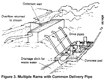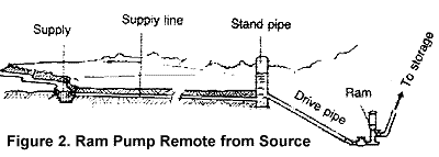 Supply. The intake must be designed to keep trash and sand out of the supply since these can plug up the ram. If the water is not naturally free of these materials, the intake should be screened or a settling basin provided. When the source is remote from the ram site, the supply line can be designed to conduct the water to a drive pipe as shown in Figure 2. The supply line, if needed, should be at least one pipe diameter larger than the drive pipe.