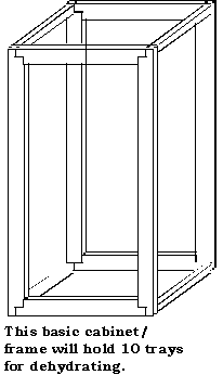 2x4's, 2x2's, 1x4's, 1x2's, 3/4 inch plywood, weather stripping, sheet metal, Plexiglas, cardboard, black paint, screws & nails, hinges, door latches, screen, and food safe screen. Quantity of materials will be determined on the size of dehydrator you build. This dehydrator cabinet measures 5 1/2 ft. tall by 3 ft. wide.