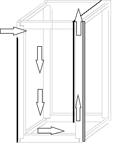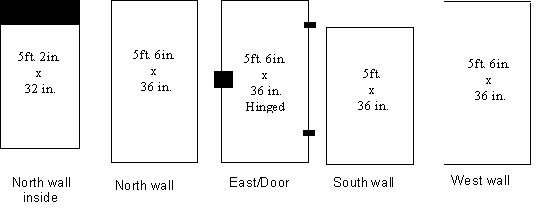 Adding the walls... There are three walls and one door, the walls are north, south and west, leaving the east as the door. There is also an inside wall that serves as a vent. The North inside wall panel is 4 inches shorter than the outside wall to allow for the vent at the bottom. See diagram below.