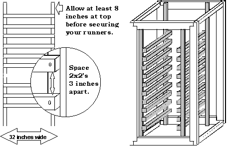 The tray runners are made up of 2x2's measuring 32 inches long, spaced 3 inches apart. Space the runner braces 26 inches apart. Leaving extra space between the right brace and the inside wall, this will allow the air to circulate.
