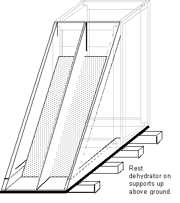 The south wall opens into the solar area of the dehydrator at the top, about 4-6 inches, which brings the air into the cabinet and circulates down through the vent at the bottom of the inside wall and is moved up the chimney and out the vent at the top. Air circulation is of utmost importance, as the moisture must be able to escape the cabinet, and all the product must be exposed to circulation, in order for proper drying.