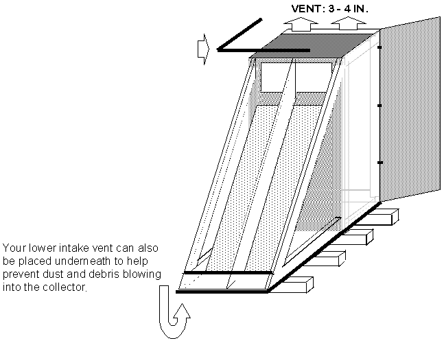To build the collector, attach 2x4's cut at a 35 or 45 degree angle to the cabinet. Run a 1x4 cut at the same angle down the middle. See diagram. Enclose the bottom of the cabinet and the collector with plywood. The top and sides of the collector are covered with the Plexiglas. Leave an opening at the bottom to allow the air to flow in, cover with screen to keep bugs out. Cut a section of cardboard and secure to the back of the 1x4 and underneath to the bottom of the collector. Paint the inside of the collector black.